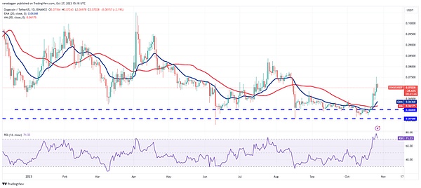 我发现一个很有趣的现象:比特币价格始终保持在100小时均线(33,400美元)上方徘徊。作为一名长期关注加密货币市场的观察者,我深知这个技术指标的重要性。就像2019年那次反弹一样,只要不跌破这个关键支撑位,多头就依然掌控着局面。
